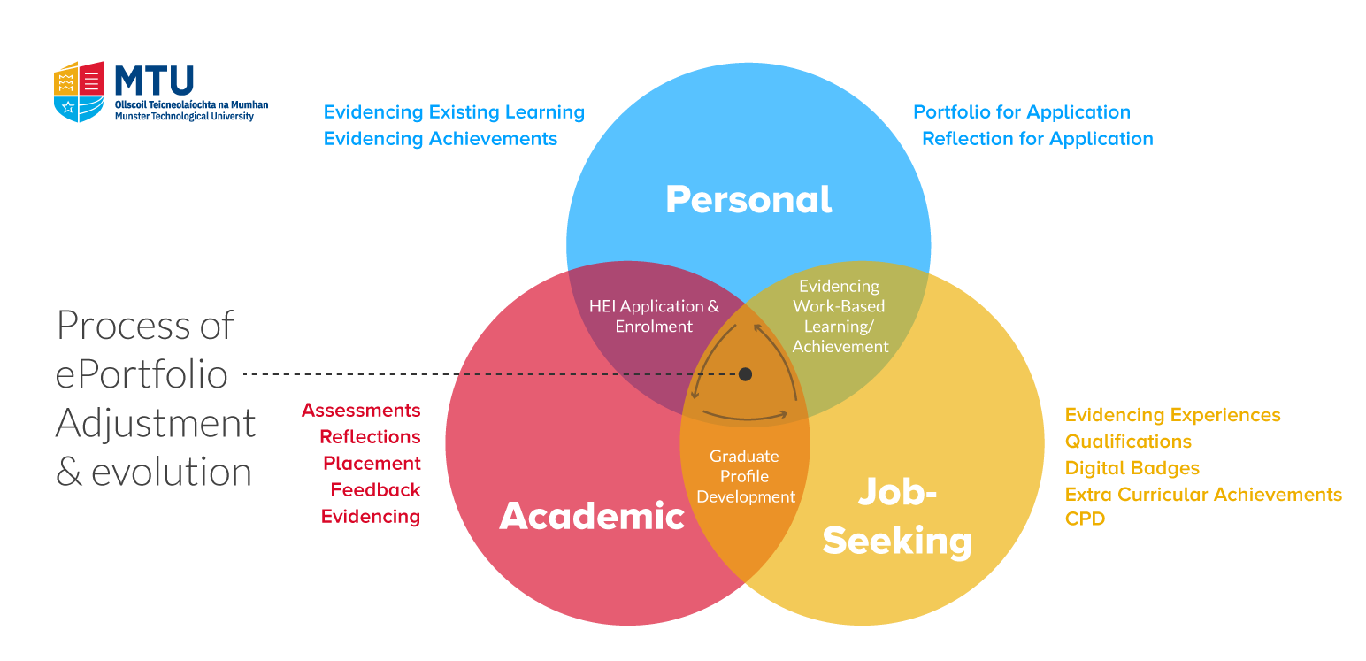- For prospective students: The ePortfolio should be aligned to presentation of work or experience in a fairly free and informal context. This is represented as the “Personal” category below.