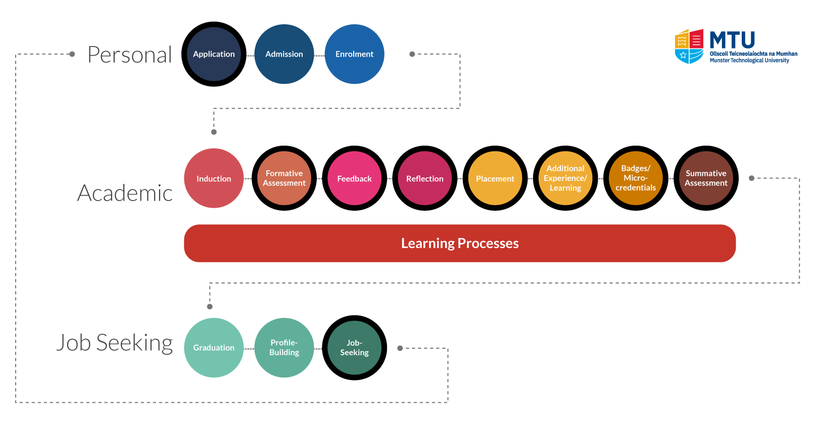 Based on this and the further analysis of the student lifecycle presented earlier, we can revisit our earlier representation of the learning process (aligned to the “Academic” category) and expand the application of ePortfolios to the “Personal” and “Job-seeking” categories to include additional crucial activities in the student lifecycle, including the use of an ePortfolio as a support for application and admission, induction, representation for Recognition of Prior or informal Learning, graduate activities (including – crucially – job seeking), etc.
